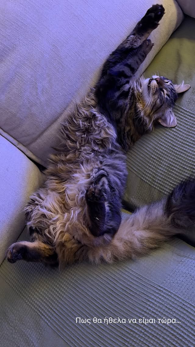 Στο πρώτο story φαίνεται η αγάπη που τρέφει για το ένα γατάκι της, το οποίο είναι ξαπλωμένο στον καναπέ και την ίδια να γράφει: «Πώς θα ήθελα να είμαι τώρα».