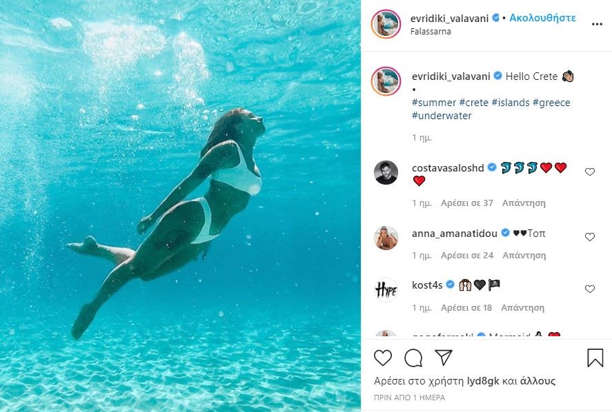 Η Ευρυδίκη Βαλαβάνη δημοσίευσε στον προσωπικό της λογαριασμό στο Instagram μία φωτογραφία στην οποία ποζάρει σαν γοργόνα φορώντας ένα λευκό μπικίνι. Όπως ήταν φυσικό τα θετικά σχόλια από τους διαδικτυακούς της φίλους έπεσαν βροχή.