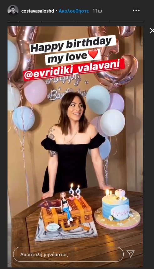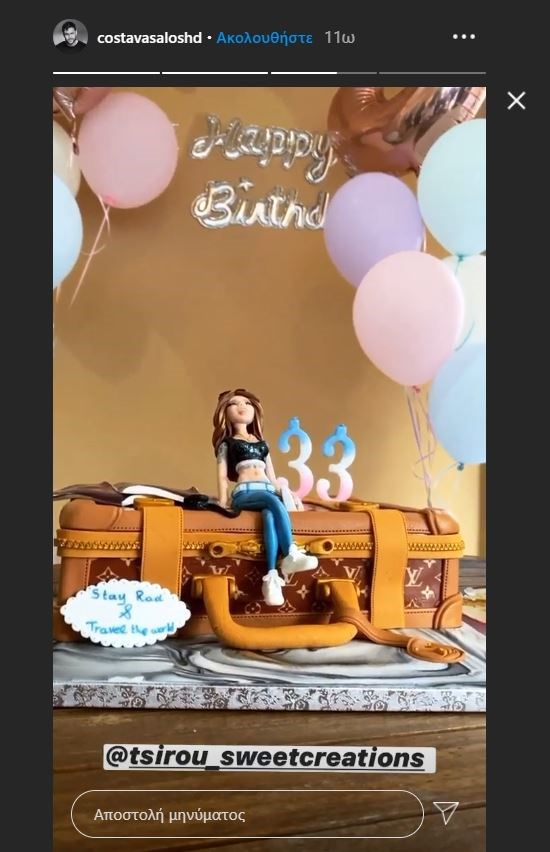 Ο Κωνσταντίνος Βασάλος ανέβασε στον προσωπικό του λογαριασμό στο Instagram ένα βίντεο στο οποίο η εορτάζουσα σβήνει τα κεράκια της σε δύο εντυπωσιακές τούρτες. Η αγάπη της για τα ταξίδια είναι γνωστή και έτσι η μία από τις τούρτες απεικονίζει την ίδια να κάθεται πάνω σε μία βαλίτσα.