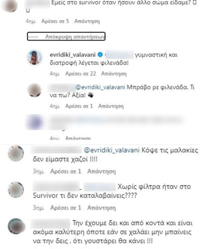 «Εμείς στο survivor όταν ήσουν άλλο σώμα είδαμε;», έγραψε μια follower με την Ευρυδίκη να απαντά: «Γυμναστική και διατροφή λέγεται φιλενάδα».