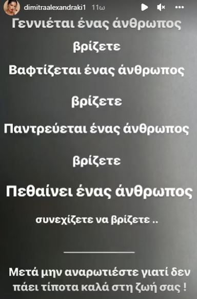 Πριν από λίγες μέρες είχε γράψει επίσης: «Επειδή το 80% των ερωτήσεων είναι πότε παντρεύομαι και γιατί δεν δείχνω τον σύντροφό μου θα σας απαντήσω ότι πρώτον δεν είναι τσάντα και δεύτερον γιατί έχει να κάνει με προσωπική ζωή. Κάτι που δεν θέλω να εκθέσω, είναι κάτι ιερό, κάτι όμορφο και δεν θέλω να το χαλάσω. Δεν μπορείτε να το σεβαστείτε; Σκεφτείτε κάποιον να σας πιέζει για κάτι που δεν θέλετε να το κάνετε. Μπείτε στη θέση μου σας παρακαλώ»
