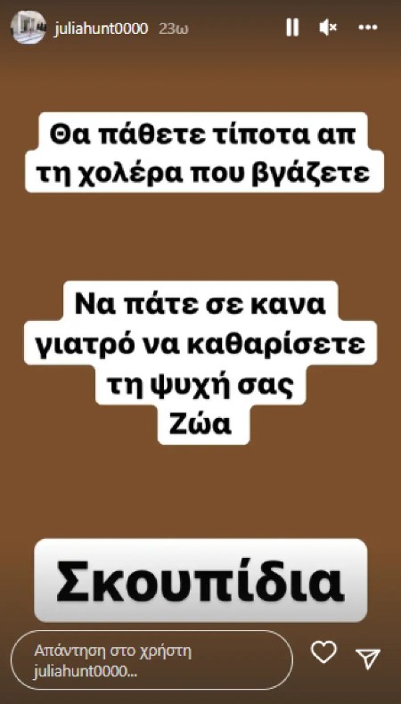 “Θα πάθετε τίποτα απ’ τη χολέρα που βγάζετε. Να πάτε σε κάνα γιατρό να καθαρίσετε την ψυχή σας. Ζώα. Σκουπίδια”, έγραψε σε InstaStory στο προφίλ της, μη μπορώντας να συγκρατήσει τον θυμό της εναντίον όσων αναφέρθηκαν αρνητικά στην ευχάριστη είδηση.