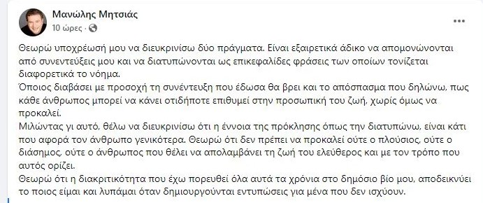 Ωστόσο, ο Μανώλης Μητσιάς, θέλησε μέσω Facebook να διευκρινίσει τα όσα είπε, τονίζοντας, μεταξύ άλλων, ότι απομονώθηκαν φράσεις του από τη συνέντευξη που παραχώρησε.