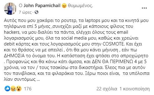“Αυτός που μου χακάρει το ρούτερ, τα laptops μου και τα κινητά μου τηλέφωνα επί 5 μήνες ,συνεχίζει μαζί με κάποιους φίλους του hackers, να μου διαλύει τα πάντα, ελέγχει όλους τους email λογαριασμούς μου, όλα τα social media μου, καθώς και χρεώνει debit κάρτες και τους λογαριασμούς μου στην COSMOTE. Και έχει και το θράσος να με απειλεί, ότι θα μου κάνει μήνυση , εάν πω ΔΗΜΟΣΙΑ το όνομα του. Η κατάσταση έχει φτάσει στο απροχώρητο . Προφανώς και θα κάνω κάτι άμεσα, και ΔΕΝ ΘΑ ΠΕΡΙΜΕΝΩ 4 με 5 χρόνια, να τον / τους τσακίσω στα δικαστήρια. Έλεος πια με αυτόν τον πανίβλακα, και τα φιλαράκια του. Ξέρω ποιοι είναι, τα υπόλοιπα λίαν συντόμως”, έγραψε ο Γιάννης Παπαμιχαήλ.