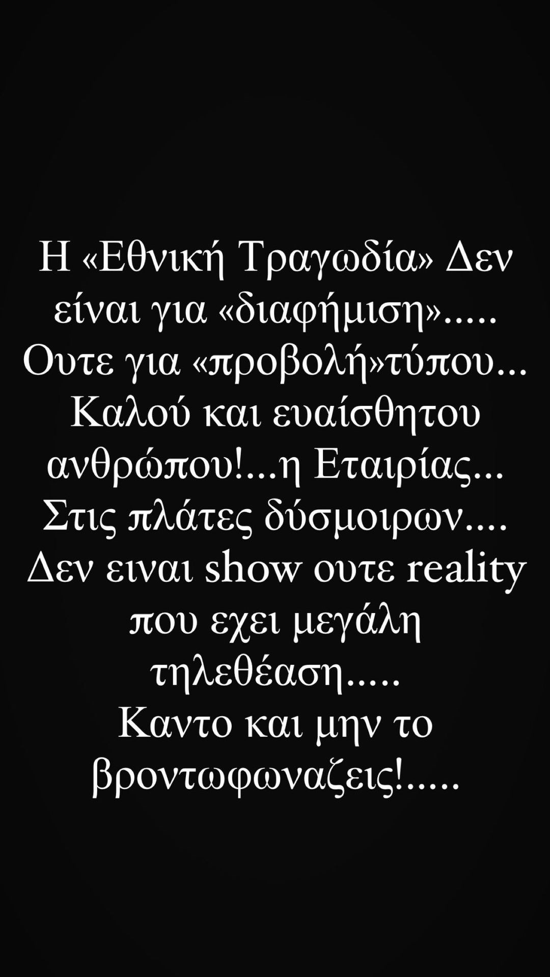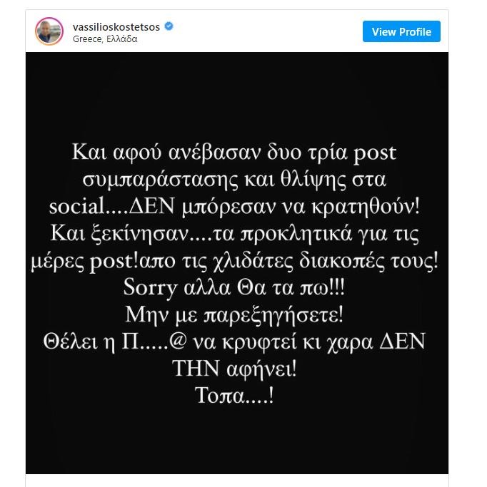 “Και αφού ανέβασαν δύο τρία post συμπαράστασης και θλίψης στα social.. δεν μπόρεσαν να κρατηθούν! Και ξεκίνησαν… τα προκλητικά για τις ημέρες post από τις χλιδάτες διακοπές τους! Sorry αλλά θα τα πω! Μην με παρεξηγήσετε! Θέλει η π…. να κρυφτεί και η χαρά δεν την αφήνει!!! Το’ πα” ανέφερε αρχικά ο Βασίλειος Κωστέτσος.