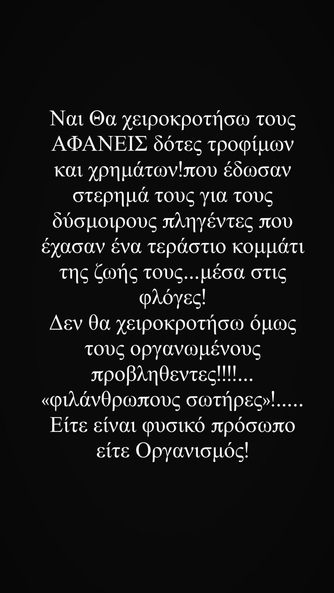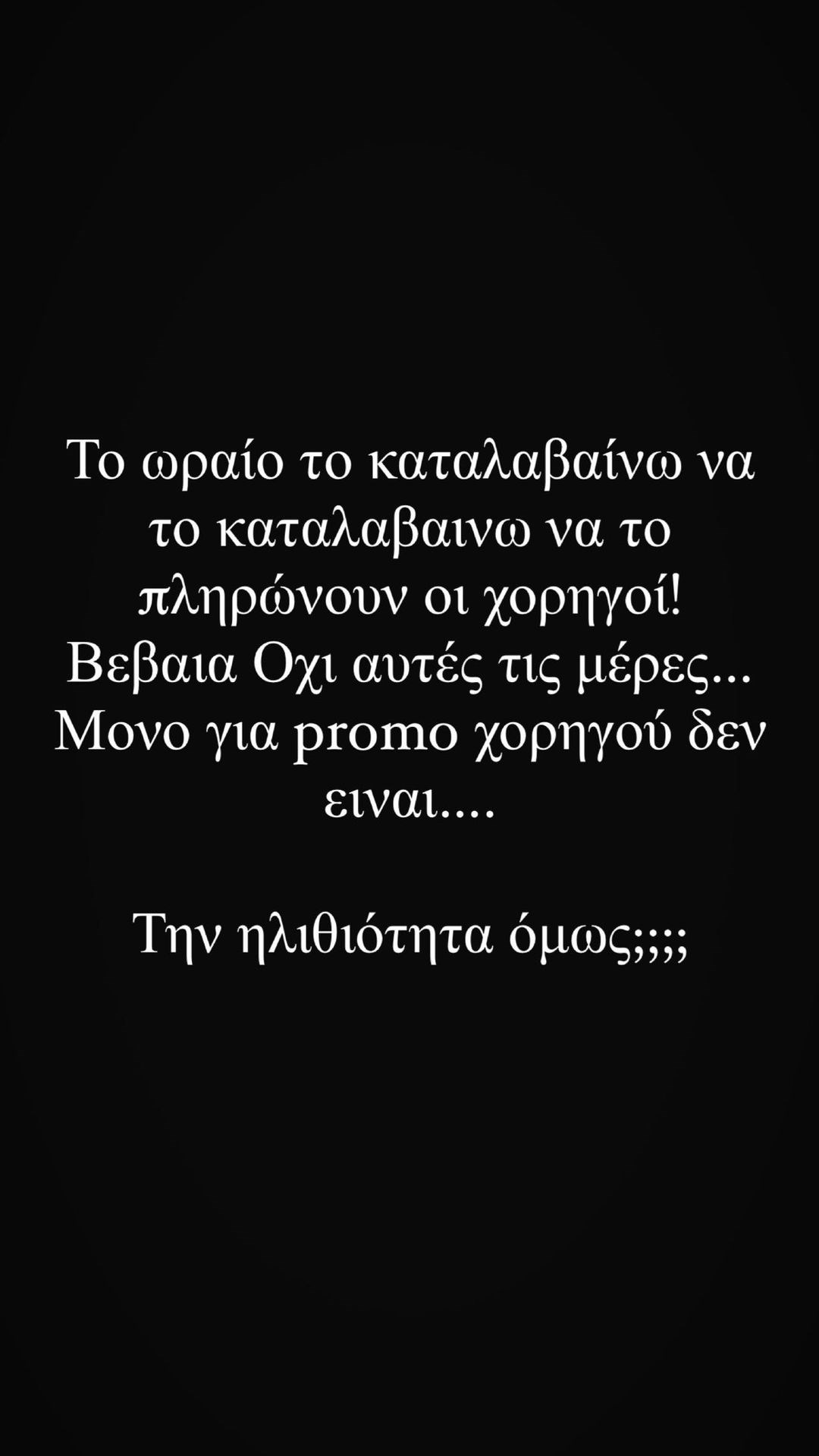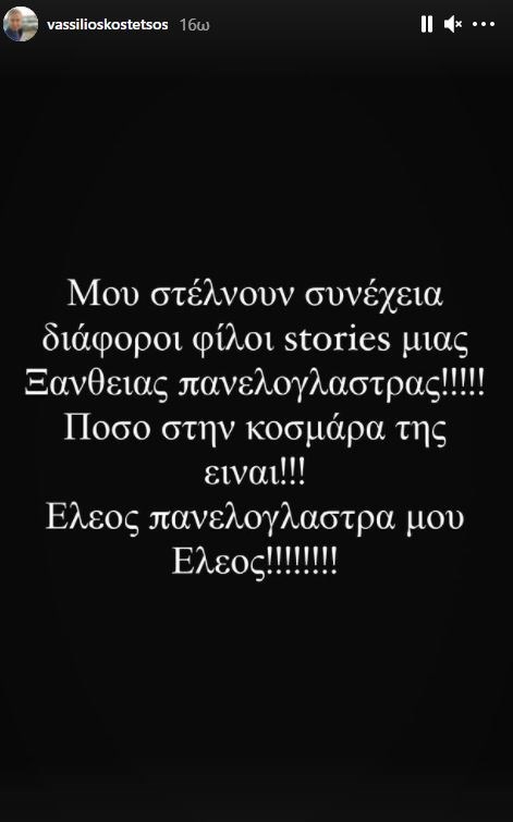 Λίγο αργότερα, ο σχεδιαστής έκανε και μια σειρά stories. Σε ένα από αυτά είναι ιδιαίτερα αιχμηρός, αναφέροντας: “Μου στέλνουν συνέχεια κάτι φίλοι stories μιας ξανθιάς πανελογλάστρας! Πόσο στην κοσμάρα της είναι! Έλεος πανελογλάστρα μου! Έλεος!”.