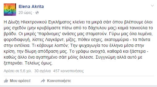 Δείτε τι έγραψε η Έλενα Ακρίτα στο facebook: