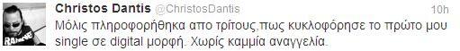 Ο Χρήστος Δάντης δεν χάνει εύκολα την ψυχραιμία του… Όταν, όμως, πριν από λίγες ώρες πληροφορήθηκε, σύμφωνα πάντα με τον ίδιο, ότι κυκλοφόρησε το single του σε digital μορφή, χωρίς ο ίδιος να το γνωρίζει, πέρασε στην επίθεση μέσω του twitter του. Διαβάστε τι έγραψε: