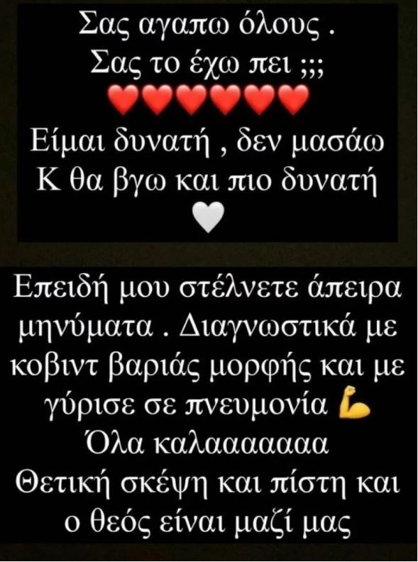 Όπως έκανε η ίδια γνωστό μέσα από τον λογαριασμό της στο Instagram, η κατάσταση της υγείας της επιδεινώθηκε και γι’ αυτό χρειάστηκε να νοσηλευτεί. «Σας αγαπώ όλους. Σας το έχω πει; Είμαι δυνατή, δεν μασάω και θα βγω πιο δυνατή. Επειδή μου στέλνετε άπειρα μηνύματα. Διαγνώστηκα με κόβιντ βαριάς μορφής και με γύρισε σε πνευμονία. Όλα καλά. Θετική σκέψη και πίστη και ο Θεός είναι μαζί μας» έγραψε αρχικά ενώ σε επόμενη ανάρτησή της ανέφερε: «Παιδιά και όσοι δεν έχετε εμβολιαστεί κάντε το όσο πιο γρήγορα. Σας το λέω εγώ που το αμελούσα και έλεγα φοβάμαι ας μην το κάνω, ας το αφήσω λίγο ακόμα. Εξάλλου μπρος γκρεμός και πίσω ρέμα. Σίγουρα από το να νοσήσετε θα είναι καλύτερο».