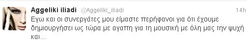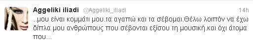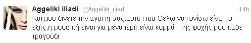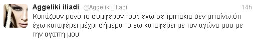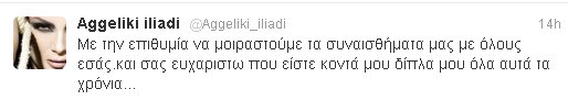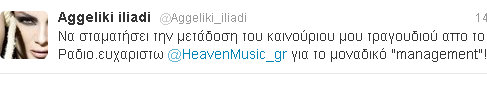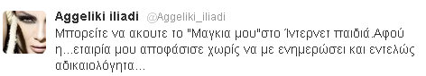 Το twitter έχει γίνει τόπος διαμαρτυρίας και καταγγελιών! Σειρά να χρησιμοποιήσει την καταγγελτική του πλευρά, πήρε η Αγγλελική Ηλιάδη, που με απανωτά tweets, -8 για την ακρίβεια-, επιτέθηκε στην δισκογραφική της εταιρεία, επειδή σταμάτησε την μετάδοση του νέου της τραγουδιού “Μαγκιά μου”. Διευθυντής εκεί δεν είναι ο κολλητός της φίλος, Μάκης Πουνέντης; Ή δεν είναι πια;… κολλητός της εννοούμε!Διαβάστε τι έγραψε: