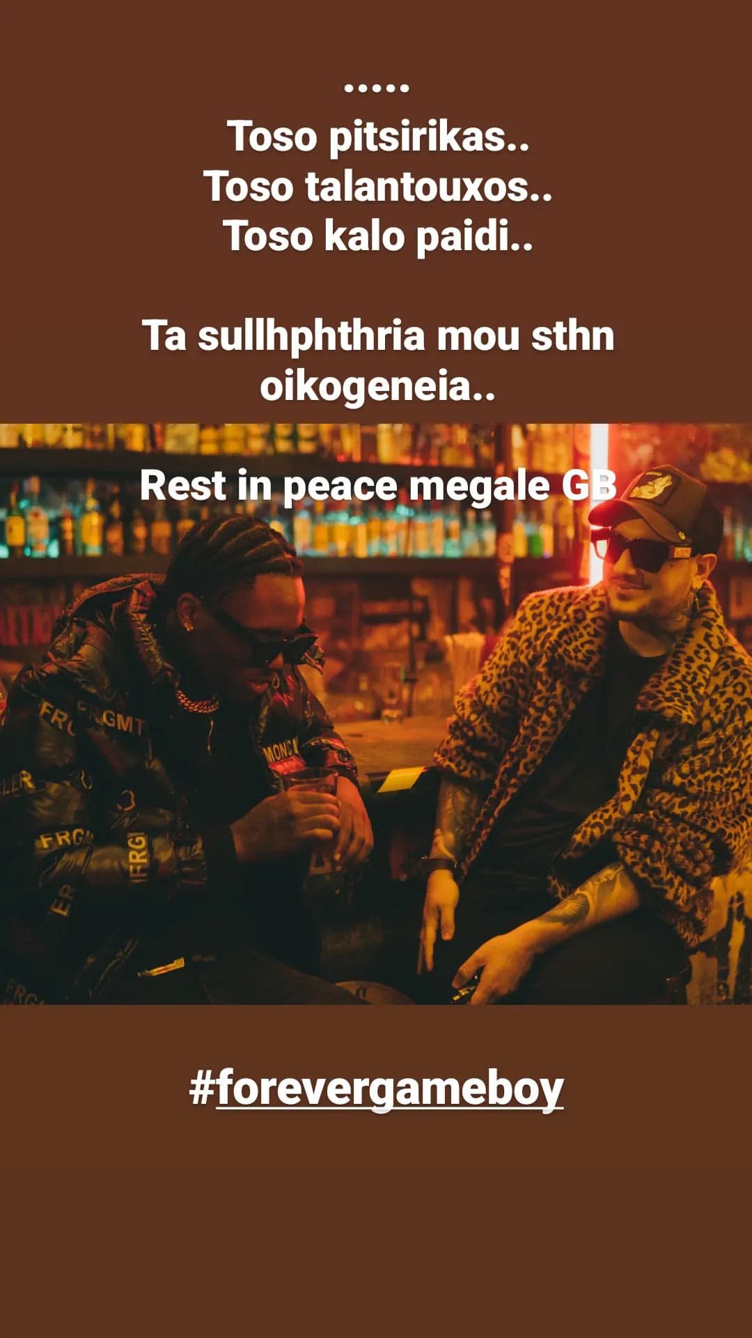 Παράλληλα φίλοι του και συνάδελφοί του, τον αποχαιρέτησαν μέσω των προφίλ που διατηρούν στο instagram. Ένας εξ αυτών και ο γνωστός τράπερ και αδελφός του Snik, MG ο οποίος ανέβασε μία κοινή τους φωτογραφία και έγραψε: «Τόσο πιτσιρικάς… Τόσο ταλαντούχος… Τόσο καλό παιδί… Τα συλλυπητήριά μου στην οικογένεια… Αναπαύσου εν ειρήνη μεγάλε GB».