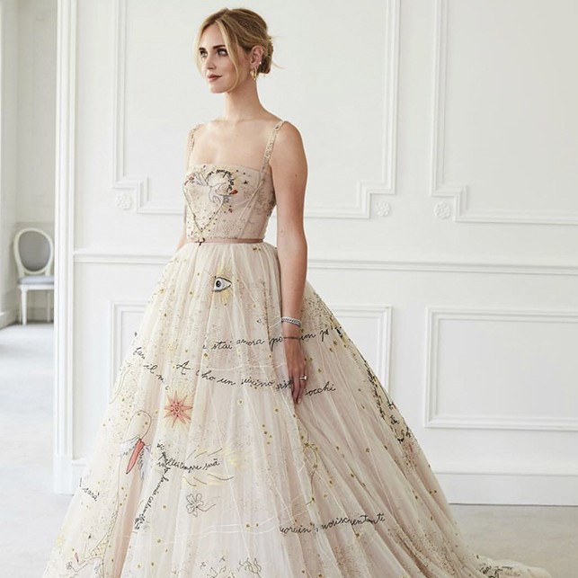 Η νύφη στη δεξίωση που ακολούθησε φόρεσε ένα φόρεμα επίσης του Οίκου Dior, στο οποίο είχε σύμβολα από τη σχέση της με τον Fedez, αλλά και στίχους από το τραγούδι με το οποίο της έκανε πρόταση γάμου.