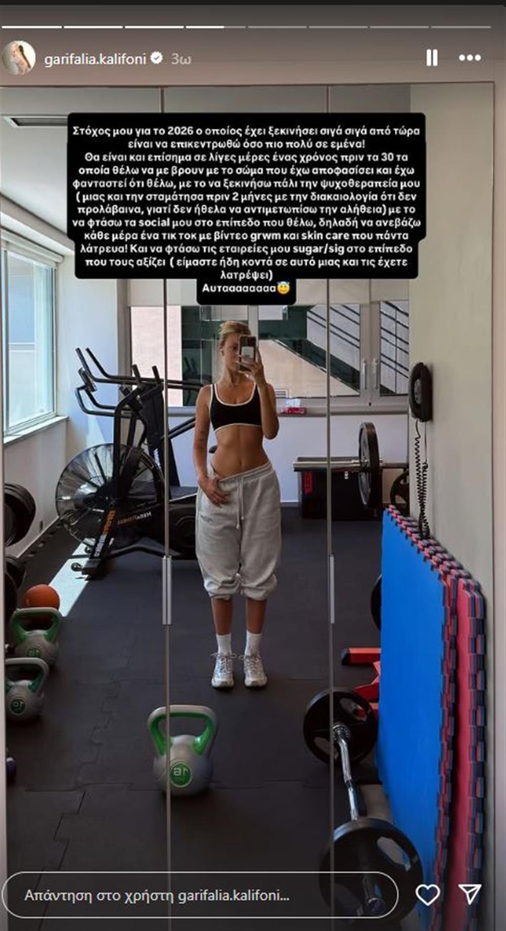 «Στόχος μου για το 2026 ο οποίος έχει ξεκινήσει σιγά σιγά από τώρα είναι να επικεντρωθώ όσο πιο πολύ σε εμένα! Θα είναι και επίσημα σε λίγες μέρες ένας χρόνος πριν τα 30 τα οποία θέλω να με βρουν με το σώμα που έχω αποφασίσει και έχω φανταστεί ότι θέλω, με το να ξεκινήσω πάλι την ψυχοθεραπεία μου (μιας και την σταμάτησα πριν 2 μήνες με την δικαιολογία ότι δεν προλάβαινα, γιατί δεν ήθελα να αντιμετωπίσω την αλήθεια).