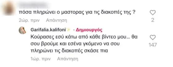 Κάτω από το βίντεο αυτό η Γαρυφαλλιά Καληφώνη δέχτηκε αρκετά σχόλια, κάποια εκ των οποίων και αρνητικά. Ένα από αυτά όμως ήταν που την εκνεύρισε περισσότερο και την έκανε να απαντήσει δημόσια.