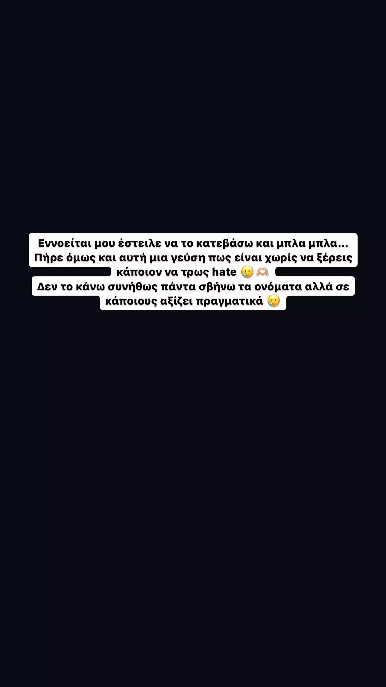 «Εννοείται μου έστειλε να το κατεβάσω και μπλα μπλα… Πήρε όμως και αυτή μια γεύση πως είναι χωρίς να ξέρεις κάποιον να τρως hate. Δεν το κάνω συνήθως, πάντα σβήνω τα ονόματα αλλά σε κάποιους αξίζει πραγματικά» έγραψε αρχικά η Γαρυφαλλιά Καληφώνη.