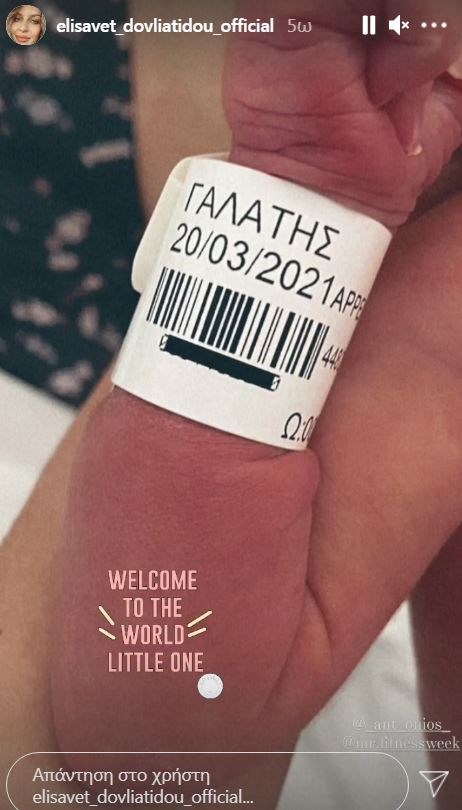Η Ελισάβετ Δοβλιατίδου ήταν αυτή που γνωστοποίησε το ευχάριστο γεγονός μέσα από τον προσωπικό της λογαριασμό στο Instagram, αφού κοινοποίησε μια πολύ τρυφερή φωτογραφία, στην οποία κρατάει το χεράκι του μικρού της πρίγκιπα.“Καλώς ήρθες στον κόσμο μικρέ”, έγραψε η γλυκιά μανούλα στην φωτογραφία που κοινοποίησε.