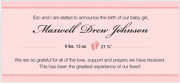 Η Jessica Simpson μόλις γέννησε…Σύμφωνα με το “US Weekly”, πριν από λίγο η τραγουδίστρια – ηθοποιός έφερε στον κόσμο το πρώτο της παιδί, σε μαιευτήριο στο Los Angeles.Το όνομα που της έδωσαν είναι Maxwell Drew και είναι το μεσαίο όνομα της μαμάς της Jessica, Tina Simpson. To μωρό γεννήθηκε 4,121 κιλά και το ύψος του είναι 53,34 εκ. Σύμφωνα με πληροφορίες, μαμά και κόρη είναι μια χαρά. Οι πανευτυχείς γονείς έβγαλαν και ανακοίνωση…