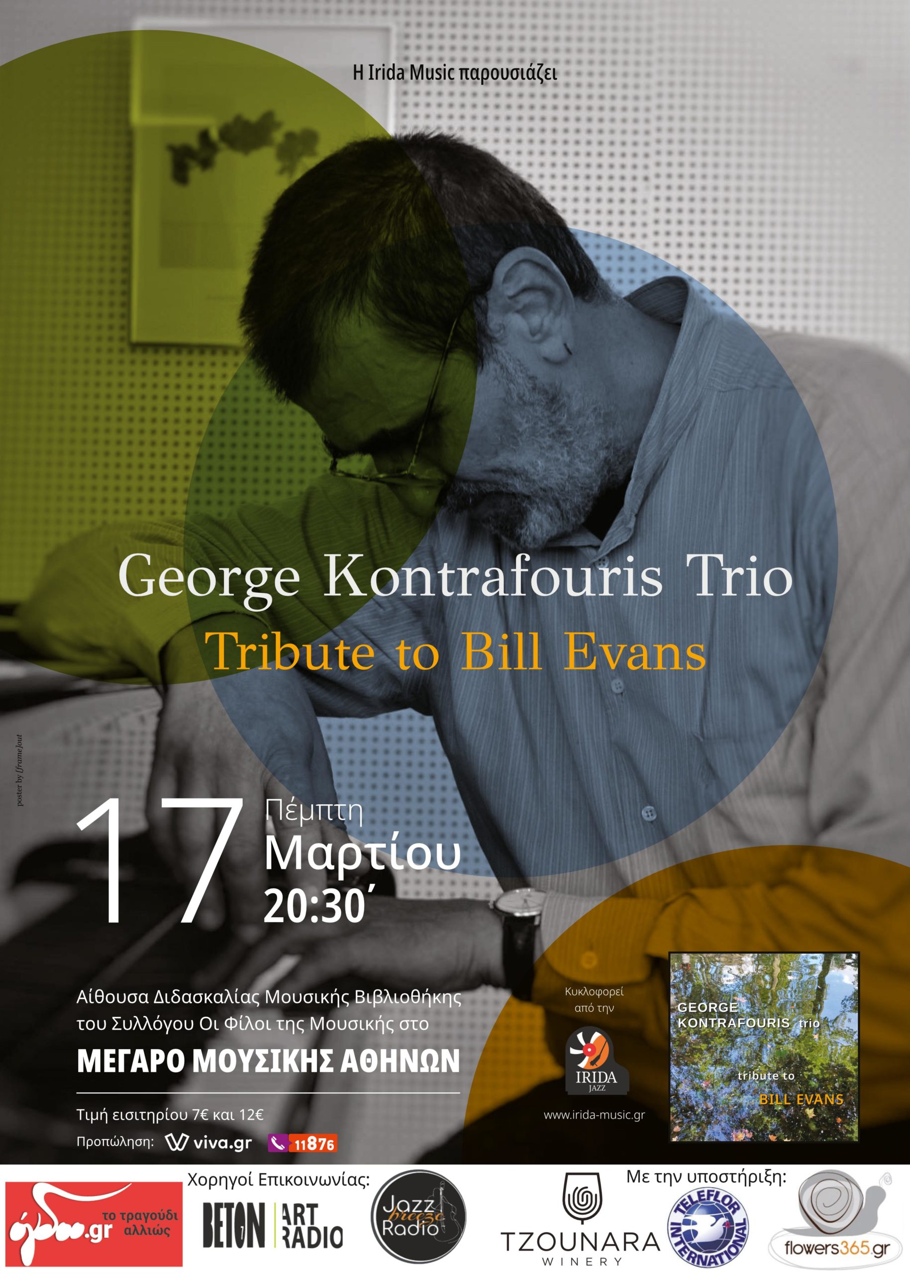 Παρουσιάζει με το τρίο του, στο οποίο συμμετέχουν οι μουσικοί Βασίλης Κουτσονάνος (κοντραμπάσο) και Παναγιώτης Θέμας (τύμπανα), τα έργα του δίσκου “Tribute to Bill Evans” στην Αίθουσα Διδασκαλίας του Μεγάρου Μουσικής, την Πέμπτη 17 Μαρτίου στις 20:30, επ’ ευκαιρία της κυκλοφορίας του νέου CD.