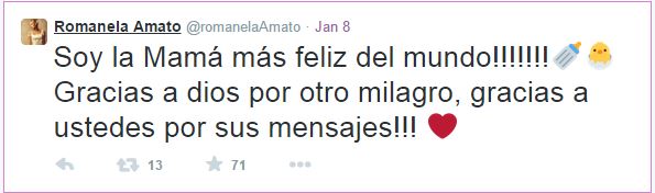 Λίγη ώρα μετά τον τοκετό η ίδια η Ρομανέλα Αμάτο θέλησε να μοιραστεί την ευτυχισμένη στιγμή του ζευγαριού με τους ακολούθους της στο Twitter. «Είμαι η πιο ευτυχισμένη μαμά του κόσμου. Ευχαριστούμε το Θεό για ένα ακόμα θαύμα, ευχαριστούμε και όλους εσάς για τα μηνύματά σας» έγραψε η σύζυγος του Σαβιόλα.