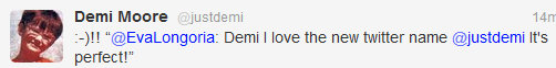 Η διάσημη ηθοποιός Demi Moore αποφάσισε να χωρίσει τον Ashton Kucher και στο twitter. Πέταξε το nick name “mrskutcher” από το προφίλ της και αποφάσισε να υιοθετήσει το “justdemi”. Οι φίλες της υποδέχτηκαν με ενθουσιασμό την αλλαγή της…Η Eva Longoria της έγραψε…