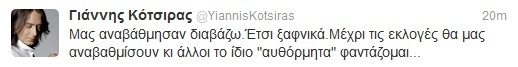 Ο γνωστός καλλιτέχνης Γιάννης Κότσιρας μας έχει συνηθίσει να σχολιάζει την επικαιρότητα. Έτσι, με αφορμή την αναβάθμιση της πιστοληπτικής ικανότητας της Ελλάδας από τον οίκο Fitch, έγραψε στο Τwitter: