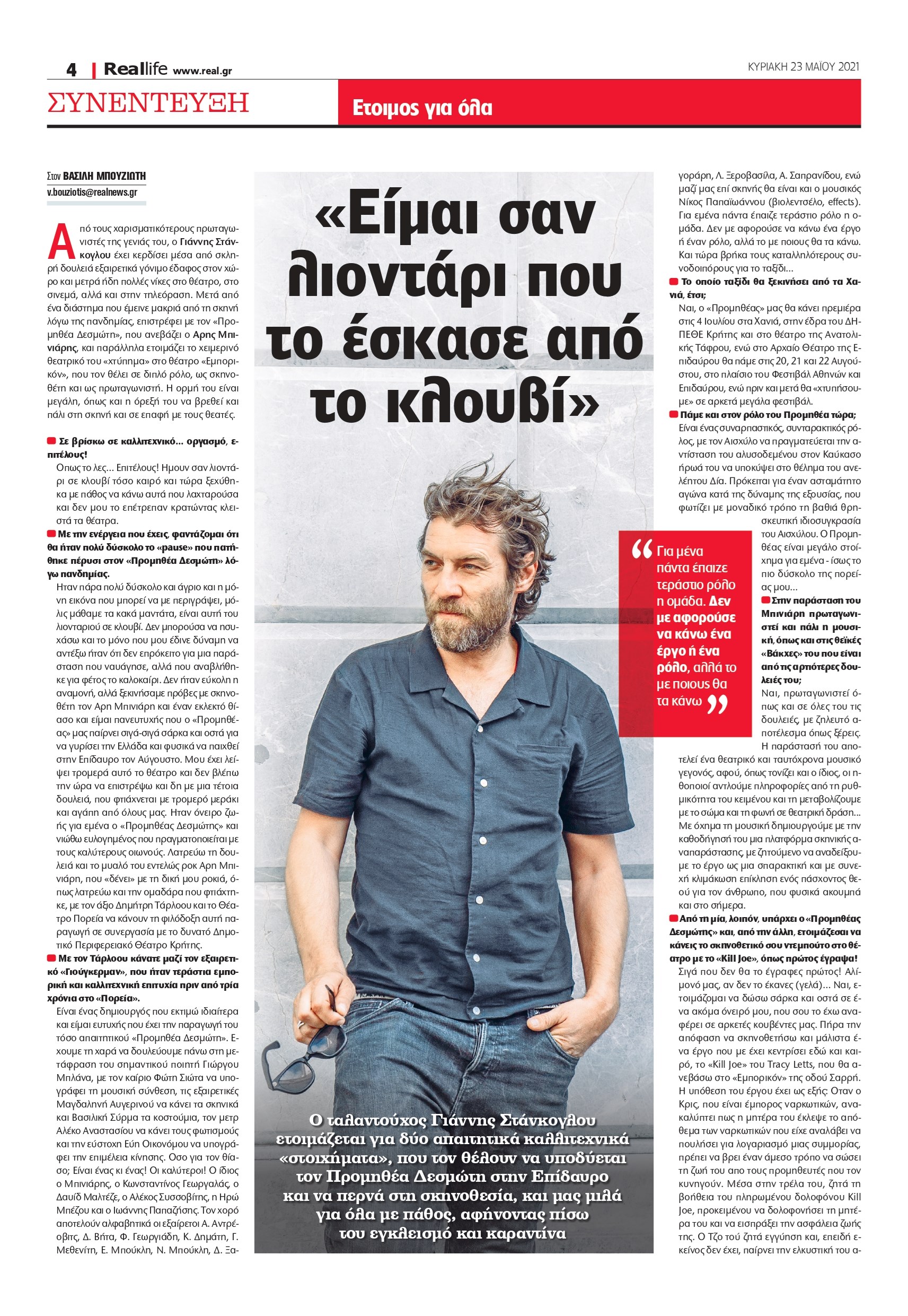 Ήταν πάρα πολύ δύσκολο και άγριο και η μόνη εικόνα που μπορεί να με περιγράψει, μόλις μάθαμε τα κακά μαντάτα, είναι αυτή του λιονταριού σε κλουβί. Δεν μπορούσα να ησυχάσω και το μόνο που μου έδινε δύναμη να αντέξω ήταν ότι δεν επρόκειτο για μια παράσταση που ναυάγησε, αλλά που αναβλήθηκε για φέτος το καλοκαίρι. Δεν ήταν εύκολη η αναμονή, αλλά ξεκινήσαμε πρόβες με σκηνοθέτη τον Άρη Μπινιάρη και έναν εκλεκτό θίασο και είμαι πανευτυχής που ο «Προμηθέας» μας παίρνει σιγά-σιγά σάρκα και οστά για να γυρίσει την Ελλάδα και φυσικά να παιχθεί στην Επίδαυρο τον Αύγουστο. Μου έχει λείψει τρομερά αυτό το θέατρο και δεν βλέπω την ώρα να επιστρέψω και δη με μια τέτοια δουλειά, που φτιάχνεται με τρομερό μεράκι και αγάπη από όλους μας. Ήταν όνειρο ζωής για εμένα ο «Προμηθέας Δεσμώτης» και νιώθω ευλογημένος που πραγματοποιείται με τους καλύτερους οιωνούς. Λατρεύω τη δουλειά και το μυαλό του εντελώς ροκ Άρη Μπινιάρη, που «δένει» με τη δική μου ροκιά, όπως λατρεύω και την ομαδάρα που φτιάχτηκε, με τον άξιο Δημήτρη Τάρλοου και το Θέατρο Πορεία να κάνουν τη φιλόδοξη αυτή παραγωγή σε συνεργασία με το δυνατό Δημοτικό Περιφερειακό Θέατρο Κρήτης.