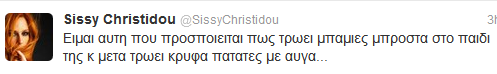 Η όμορφη παρουσιάστρια μέσα από τον λογαριασμό της στο Twitter αποκάλυψε ότι ανήκει στην κατηγορία των μαμάδων που προσποιούνται ότι τους αρέσουν οι μπάμιες, για να της τρώει ο μικρός της μπόμπιρας.Η Σίσσυ το έκανε αυτό επειδή προσέχει πολύ την διατροφή του γιου της και θέλει να τρώει υγιεινά φαγητά.