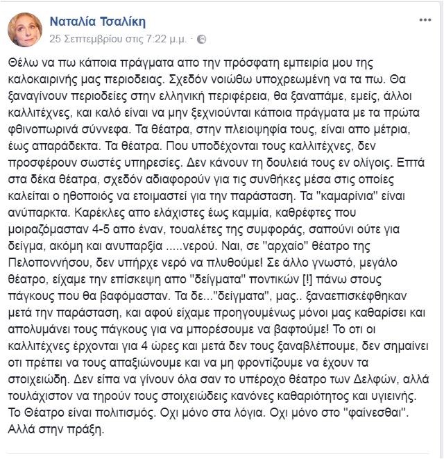 Ένα ξέσπασμα άνευ προηγουμένου είχε η ηθοποιός Ναταλία Τσαλίκη μέσω του προσωπικού της λογαριασμού στο facebook. Η ηθοποιός, μαζί με τον σύζυγό της Γιάννη Μπέζο, τον Πέτρο Φιλιππίδη, τον Βλαδίμηρο Κυριακίδη και τους υπόλοιπους συντελεστές της παράστασης «Λυσιστράτη», το καλοκαίρι πραγματοποίησαν περιοδεία σε ολόκληρη την Ελλάδα. Το ξέσπασμα της αγαπημένης ηθοποιού αφορά στην κατάσταση των ελληνικών θεάτρων ανά την επικράτεια.«Θέλω να πω κάποια πράγματα από την πρόσφατη εμπειρία μου της καλοκαιρινής μας περιοδείας. Σχεδόν νοιώθω υποχρεωμένη να τα πω. Θα ξαναγίνουν περιοδείες στην ελληνική περιφέρεια, θα ξαναπάμε, εμείς, άλλοι καλλιτέχνες, και καλό είναι να μην ξεχνιούνται κάποια πράγματα με τα πρώτα φθινοπωρινά σύννεφα. Τα θέατρα, στην πλειοψηφία τους, είναι από μέτρια, έως απαράδεκτα. Τα θέατρα. Που υποδέχονται τους καλλιτέχνες, δεν προσφέρουν σωστές υπηρεσίες. Δεν κάνουν τη δουλειά τους εν ολίγοις. Επτά στα δέκα θέατρα, σχεδόν αδιαφορούν για τις συνθήκες μέσα στις οποίες καλείται ο ηθοποιός να ετοιμαστεί για την παράσταση. Τα “καμαρίνια” είναι ανύπαρκτα. Καρέκλες από ελάχιστες έως καμία, καθρέφτες που μοιραζόμασταν 4-5 από έναν, τουαλέτες της συμφοράς, σαπούνι ούτε για δείγμα, ακόμη και ανυπαρξία… νερού. Ναι, σε αρχαίο θέατρο της Πελοποννήσου, δεν υπήρχε νερό να πλυθούμε! Σε άλλο γνωστό, μεγάλο θέατρο, είχαμε την επίσκεψη από “δείγματα” ποντικών [!] πάνω στους πάγκους που θα βαφόμασταν. Τα δε… “δείγματα”, μας… ξαναεπισκέφθηκαν μετά την παράσταση, και αφού είχαμε προηγουμένως μόνοι μας καθαρίσει και απολυμάνει τους πάγκους για να μπορέσουμε να βαφτούμε! Το ότι οι καλλιτέχνες έρχονται για 4 ώρες και μετά δεν τους ξαναβλέπουμε, δεν σημαίνει ότι πρέπει να τους απαξιώνουμε και να μην φροντίζουμε να έχουν τα στοιχειώδη. Δεν είπα να γίνουν όλα σαν το υπέροχο θέατρο των Δελφών, αλλά τουλάχιστον να τηρούν τους στοιχειώδεις κανόνες καθαριότητος και υγιεινής. Το Θέατρο είναι πολιτισμός. Όχι μόνο στα λόγια. Όχι μόνο στο “φαίνεσθαι”. Αλλά στην πράξη», έγραψε εξοργισμένη η ηθοποιός.