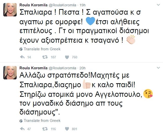Η Ρούλα Κορομηλά όπως φαίνεται παρακολουθεί φανατικά το Survivor και δεν διστάζει να πει τη γνώμη της για τους παίκτες.Σχολιάζοντας το χθεσινό επεισόδιο, η διάσημη παρουσιάστρια, μέσω του προσωπικού της λογαριασμού στο Twitter, εξέφρασε τη συμπάθειά της προς το πρόσωπο των ημερών, Γιάννη Σπαλιάρα, ο οποίος ψηφίστηκε από την ομάδα του, να μεταφερθεί στην ομάδα των “Μαχητών”. «Σπαλιάρα ! Πες τα ! Σ’ αγαπούσα και σ’ αγαπώ ρε όμορφε! Έτσι αλήθειες επιτέλους. Γιατί οι πραγματικοί διάσημοι έχουν αξιοπρέπεια και τσαγανό!», έγραψε χαρακτηριστικά. Η Ρούλα Κορομηλά επίσης δήλωσε ότι υποστηρίζει και τον Γιώργο Αγγελόπουλο από τους «Διάσημους», τον οποίο χαρακτήρισε «τον μοναδικό διάσημο» από την ομάδα του.«Αλλάζω στρατόπεδο! Μαχητές με Σπαλιάρα, διάσημο και καλό παιδί! Στηρίζω ατομικά μόνο Αγγελόπουλο, τον μοναδικό διάσημο απ τους διάσημους», σχολίασε. Δείτε τα tweets: