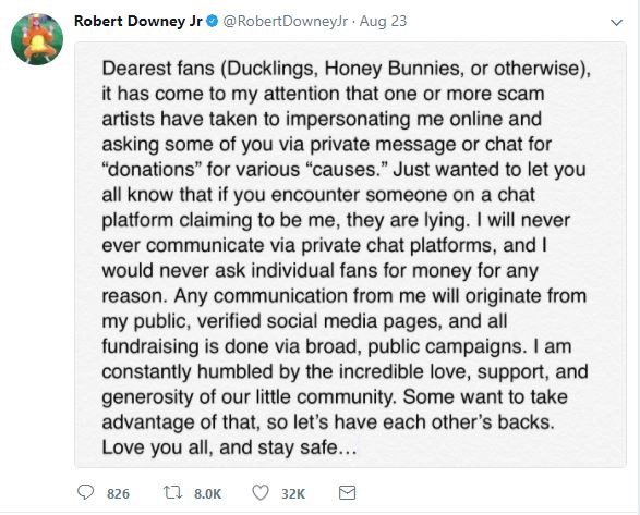 Ο διάσημος ηθοποιός του Χόλιγουντ Ρόμπερτ Ντάουνι Τζούνιορ με μήνυμα του στον προσωπικό του λογαριασμό στο Twitter προειδοποίησε τους θαυμαστές του να είναι προσεκτικοί προκειμένου να μην πέσουν θύματα απατεώνων που προσποιούνται τον ίδιο και ζητούν χρήματα.
