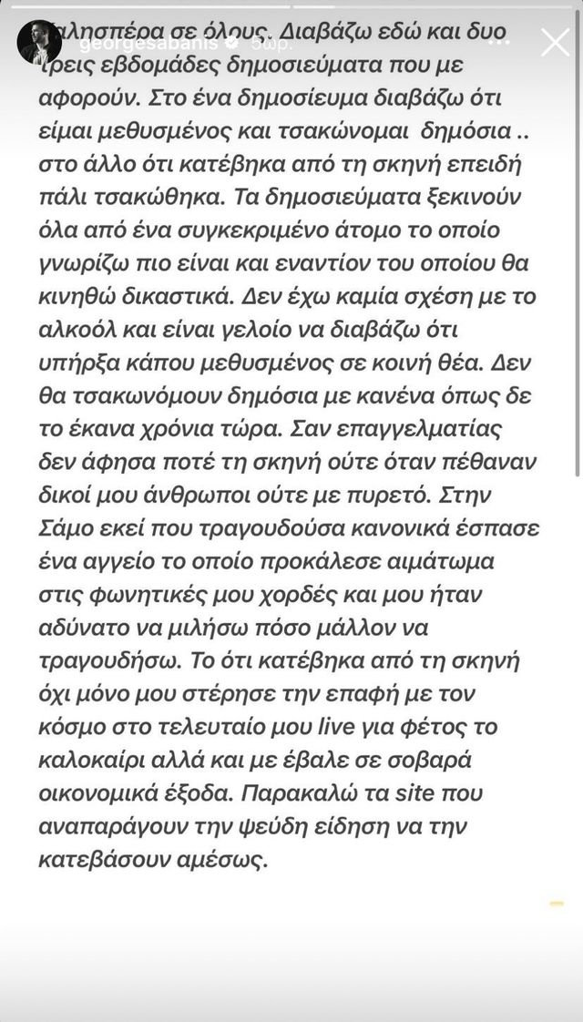 Ο Γιώργος Σαμπάνης ξέσπασε μέσω Instagram με αφορμή τα δημοσιεύματα που ανέφεραν πως έληξε την συναυλία που έδινε στη Σάμο, αφού τσακώθηκε με την σύντροφό του, Ιωάννα Σαρρή.
