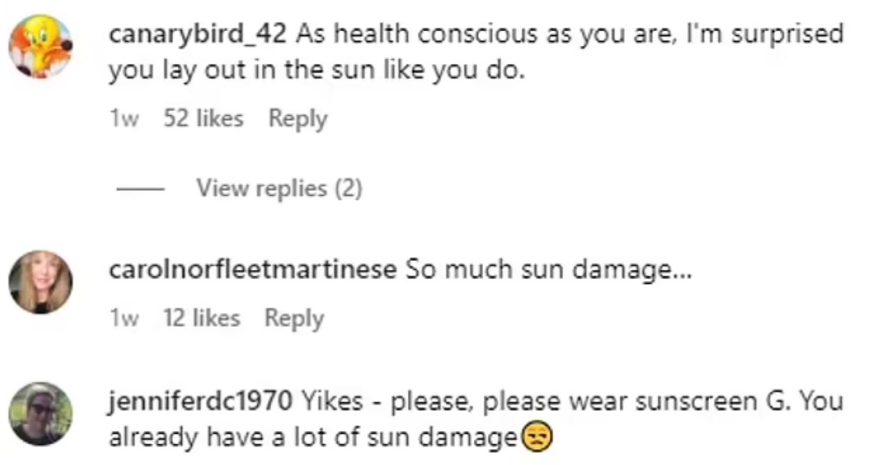 Ένας άλλος χρήστης είπε: «Για κάποια που προωθεί την υγιεινή ζωή, μην νομίζετε ότι όλος αυτός ο ήλιος φαίνεται τόσο καλά στο δέρμα σας. Ασφαλές μαύρισμα». «Όλη αυτή η φασαρία για τη φροντίδα του δέρματος και μετά το δέρμα καταστρέφεται από τον ήλιο. Δεν το καταλαβαίνω ειλικρινά!» σχολίασε κάποιος άλλος. Κάποιος άλλος σχολίασε: «Όσο συνειδητοποιημένη είσαι ως προς την υγεία σου, εκπλήσσομαι που ξαπλώνεις στον ήλιο όπως κάνεις». «Αηδία – σε παρακαλώ, σε παρακαλώ να φοράς αντηλιακό G. Έχεις ήδη πολλές βλάβες από τον ήλιο», είπε κάποιος άλλος. Ένας άλλος έγραψε: «Καλύτερα να προσέχεις το δέρμα σου Gwyneth!» Αν και το Goop δεν έχει δικό του αντηλιακό προϊόν, η ιστοσελίδα πουλάει πολλά αντηλιακά. Η φωτογραφία, η οποία κοινοποιήθηκε στις 30 Ιουνίου, δεν ήταν η πρώτη φορά κατά την οποία οι οπαδοί της Πάλτροου εξέφρασαν την ανησυχία τους για το δέρμα της.