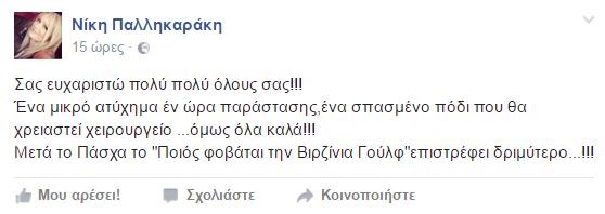 “Σας ευχαριστώ πολύ πολύ όλους σας!!! Ένα μικρό ατύχημα εν ώρα παράστασης, ένα σπασμένο πόδι που θα χρειαστεί χειρουργείο …όμως όλα καλά!!! Μετά το Πάσχα το “Ποιος φοβάται την Βιρζίνια Γούλφ”επιστρέφει δριμύτερο…!!!”