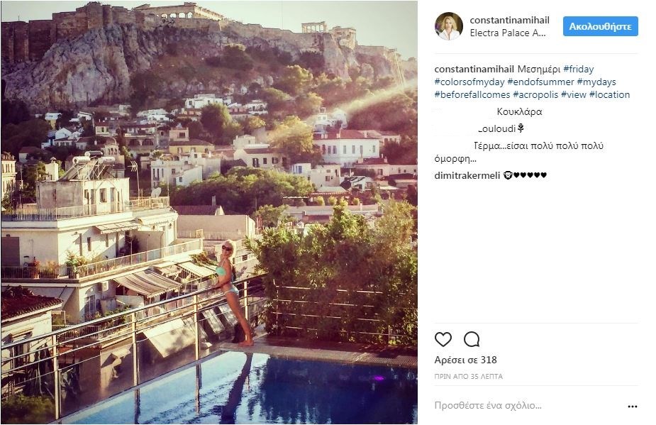 Η γνωστή ηθοποιός θέλησε σήμερα να μοιραστεί με τους διαδικτυακούς της φίλους, μία εικόνα από τις καλοκαιρινές της βουτιές στο… κέντρο της Αθήνας!Ο λόγος, για την Κωνσταντίνα Μιχαήλ, η οποία ανέβασε στον προσωπικό της λογαριασμό στο Instagram μία φωτογραφία, όπου ποζάρει δίπλα στην πισίνα, φορώντας ένα μπλε μπικίνι και με θέα τον ιερό βράχο της Ακρόπολης.Η εικόνα ήταν εντυπωσιακή και φυσικά απέσπασε εκατοντάδες likes από τους ακολούθους της.Δείτε την ανάρτηση: