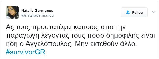 Η Ναταλία Γερμανού είναι μια από αυτές που υποστηρίζουν τον Αγγελόπουλο, γράφοντας στον προσωπικό της λογαριασμό στο twitter, ότι: «Ας τους προστατέψει κάποιος από την παραγωγή λέγοντάς τους πόσο δημοφιλής είναι ήδη ο Αγγελόπουλος. Μην εκτεθούν άλλο».