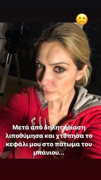 Η Έλενα Παπαβασιλείου ανέβασε μία φωτογραφία στην οποία φαίνεται ότι έχει χτυπήσει στο κεφάλι της, και έγραψε: “Μετά από δηλητηρίαση λιποθύμησα και χτύπησα το κεφάλι μου στο πάτωμα του μπάνιου”.