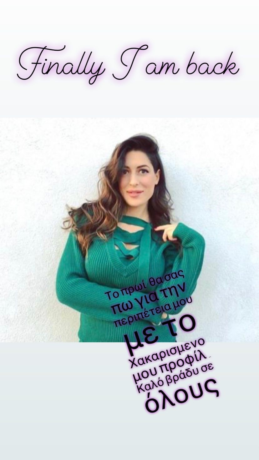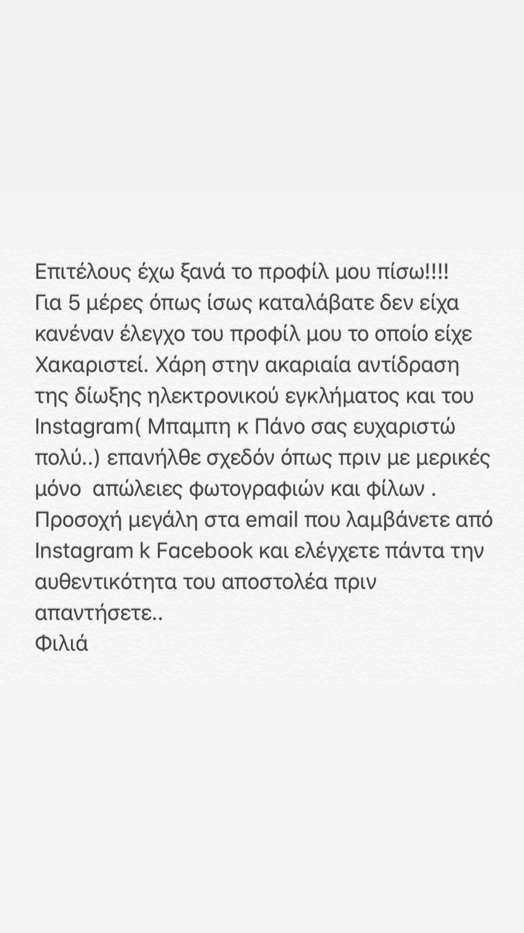 “Επιτέλους έχω ξανά το προφίλ μου πίσω! Για πέντε μέρες όπως ίσως καταλάβατε δεν είχα κανέναν έλεγχο του προφίλ μου, το οποίο είχε χακαριστεί. Χάρη στην ακαριαία αντίδραση της δίωξης ηλεκτρονικού εγκλήματος και του Instagram, επανήλθε σχεδόν όπως πριν με μερικές απώλειες φωτογραφιών και φίλων. Προσοχή μεγάλη στα email που λαμβάνετε από Instagram και Facebook και ελέγχετε πάντα την αυθεντικότητα του αποστολέα πριν απαντήσετε”, έγραψε η γνωστή παρουσιάστρια.