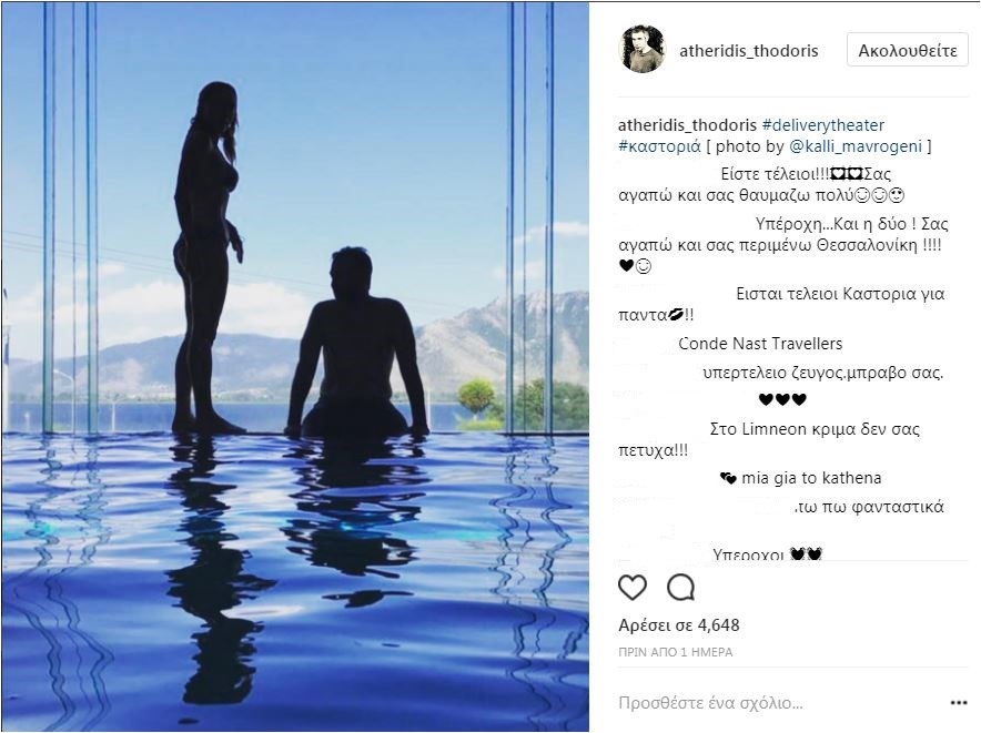 Το αγαπημένο ζευγάρι βρίσκεται στην Καστοριά, λόγω της περιοδείας της θεατρικής παράστασης, στην οποία πρωταγωνιστεί.Ο λόγος για τον Θοδωρή Αθερίδη και τη Σμαράγδα Καρύδη, οι οποίοι λίγο πριν από την παράσταση, πέρασαν στιγμές χαλάρωσης στην πισίνα του ξενοδοχείου, όπου διαμένουν.Ο Θοδωρής Αθερίδης ανέβασε μία φωτογραφία στον προσωπικό του λογαριασμό στο Instagram, και μάλιστα ξάφνιασε τους διαδικτυακούς του φίλους, αφού δεν είχε ανεβάσει ξανά φωτογραφία με τη Σμαράγδα Καρύδη.