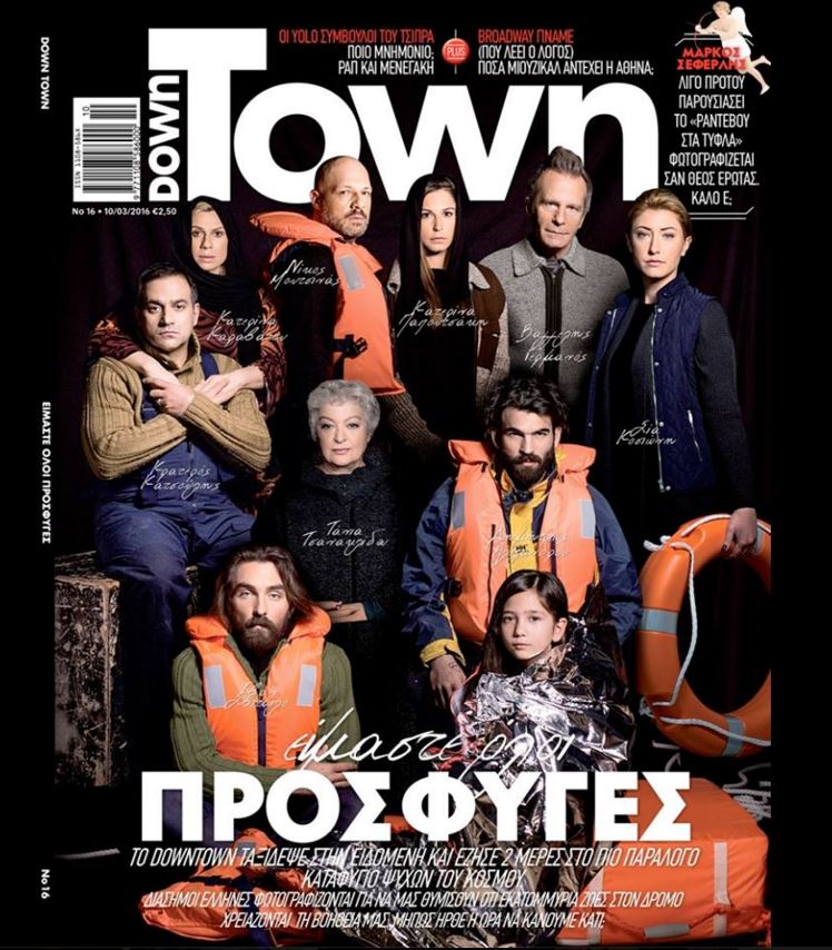 Η Σία Κοσιώνη, η Κατερίνα Παπουτσάκη, ο Βαγγέλης Γερμανός, ο Νίκος Μουτσινάς, ο Κρατερός Κατσούλης, η Κατερίνα Καραβάτου, η Τάνια Τσανακλίδου, ο Δήμητρης Αλεξάνδρου κα ο Ιβάν Σβιτάιλο, ποζάρουν στο εβδομαδίαιο περιοδικό “Down Town”, ως πρόσφυγες.