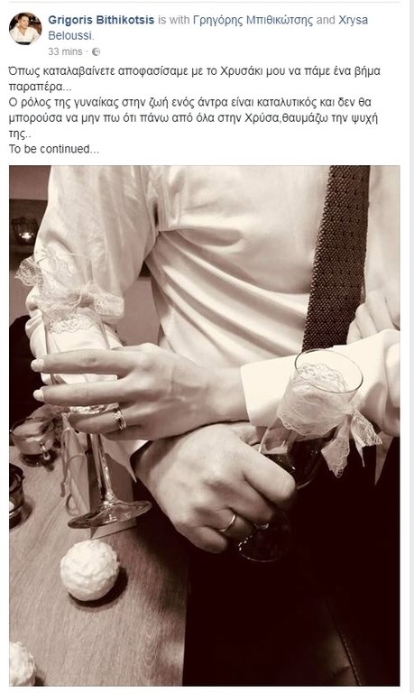 Ο Γρηγόρης Μπηθικώτσης μας εξέπληξε ευχάριστα όταν ανέβασε στο facebook φωτογραφίες από το μυστήριο και έγραψε: «Όπως καταλαβαίνετε αποφασίσαμε με το Χρυσάκι μου να πάμε ένα βήμα παραπέρα.