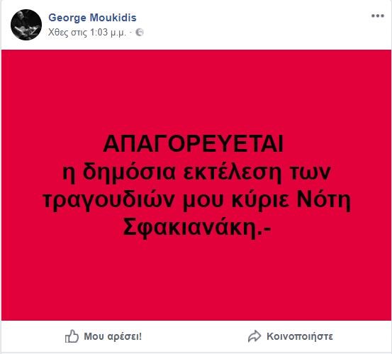 Ο γνωστός δημιουργός πολλών επιτυχιών, ανέφερε μέσω ανάρτησής του στο facebook, ότι απαγορεύει τη δημόσια εκτέλεση των τραγουδιών του, από τον Νότη Σφακιανάκη.