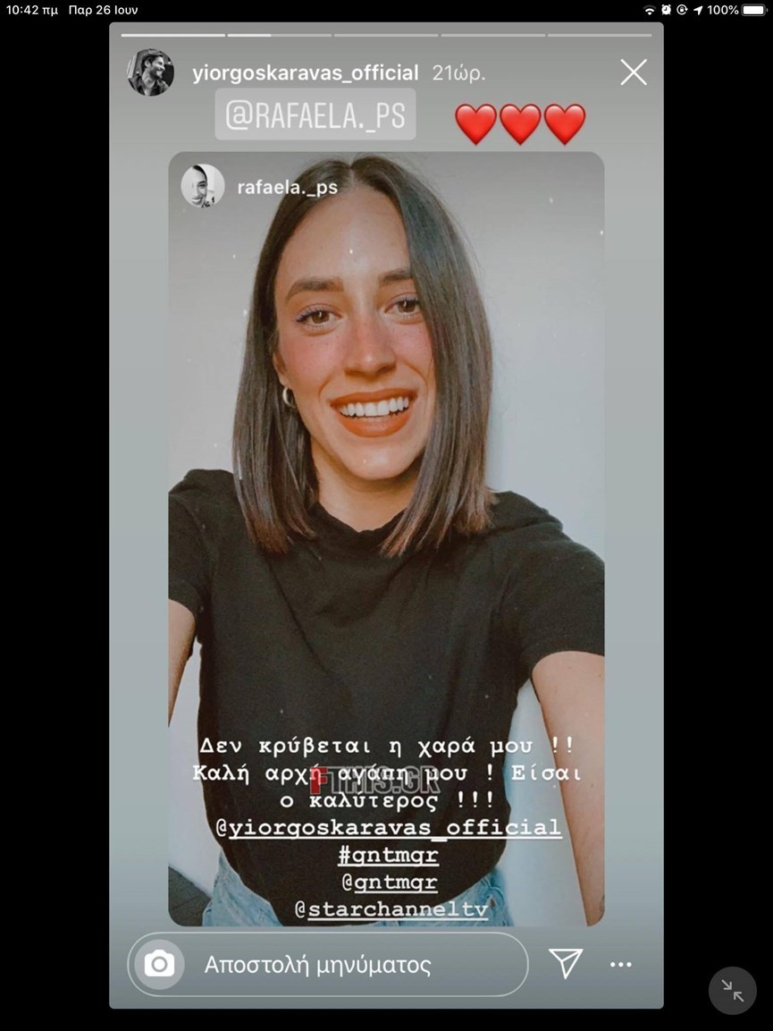 Δημοσίευσε μία φωτογραφία και έγραψε: “Δεν κρύβεται η χαρά μου!!! Καλή αρχή αγάπη μου! Είσαι ο καλύτερος” με τον Γιώργο Καράβα να αναδημοσιεύει τη συγκεκριμένη φωτογραφία προσθέτοντας μερικές καρδιές.