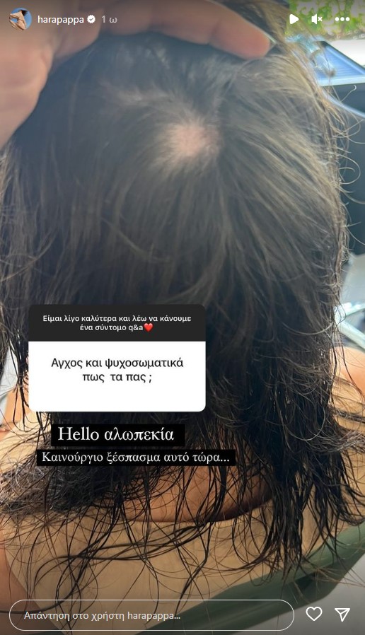 «Άγχος και ψυχοσωματικά, πώς τα πας;» ήταν η ερώτηση που της έγινε από διαδικτυακό της φίλο, με την Χαρά Παππά να του απαντάει: «Hello αλωπεκία, καινούργιο ξέσπασμα αυτό τώρα».