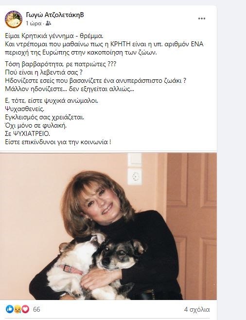 Με ανάρτησή της στην προσωπική της σελίδα στο Facebook η Γωγώ Ατζολετάκη ξέσπασε κατά των Κρητικών για την κακοποίηση των ζώων. Αφορμή στάθηκε το περιστατικό της φρικτής κακοποίησης σκύλου από έναν 55χρονο στα Χανιά, που προκάλεσε θύελλα αντιδράσεων στα social media και είχε σαν συνέπεια ο δράστης, ο οποίος εργάζεται στη ΔΕΗ, να τεθεί σε διαθεσιμότητα από τον πρόεδρο της εταιρείας.