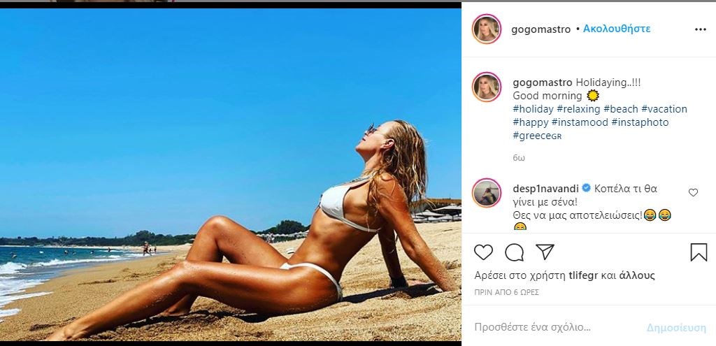 Η Δέσποινα Βανδή έσπευσε να σχολιάσει “θες να μας αποτελειώσεις;” με τη Μαστροκώστα να απαντά “όχι, διακοπές θέλω να κάνω”. Τα like έπεσαν “βροχή” στο συγκεκριμένο ενσταντανέ.