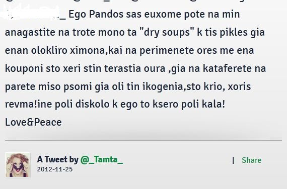 «Σας εύχομαι ποτέ να μην αναγκαστείτε να τρώτε μόνο σούπες και πίκλες για έναν ολόκληρο χειμώνα. Και να περιμένετε ώρες ολόκληρες με ένα κουπόνι στο χέρι, στην τεράστια ουρά, για να καταφέρετε να πάρετε μισό ψωμί για όλη την οικογένεια, στο κρύο, χωρίς ρεύμα. Είναι πολύ δύσκολο κι εγώ το ξέρω πολύ καλά» εξομολογήθηκε η Τάμτα στους φίλους της μέσω twitter περιγράφοντας τις πολύ δύσκολες στιγμές που έζησε στην Γεωργία.