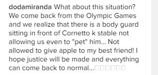 O Aλβάρο έγραψε πως είναι ιδιαίτερα λυπημένος που δεν μπορεί ούτε να πλησιάσει τον καλύτερό του φίλο, ενώ, απαντώντας σε σχόλιο διαδικτυακού του φίλου, αποκάλυψε ότι, επιστρέφοντας από τους Ολυμπιακούς Αγώνες του Ρίο, βρήκε έξω από τον στάβλο έναν άνδρα ασφαλείας, που του απαγόρευσε κάθε πρόσβαση στο τετράποδο.