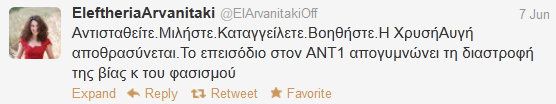 H δημοφιλής τραγουδίστρια Ελευθερία Αρβανιτάκη μέσα από το twitter της κατακεραυνώνει την επίθεση του Ηλ. Κασιδιάρη στην Λιάνα Κανέλλη και την Ρένα Δούρου.Διαβάστε τι έγραψε: