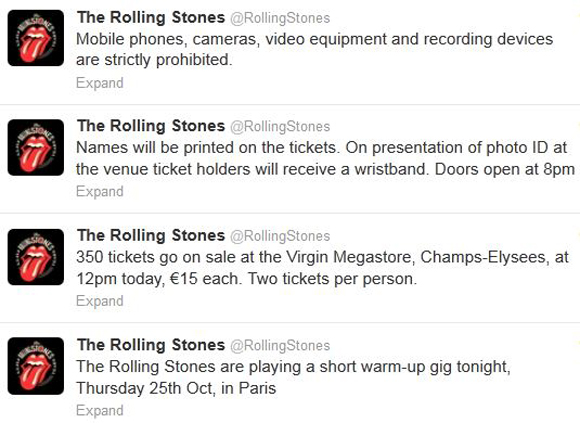 Άνω κάτω έγινε το Παρίσι μέσα σε μία μόλις ώρα. Αιτία, τα tweets του συγκροτήματος των Rolling Stones που ανακοίνωσαν από το πουθενά την αποψινή τους συναυλία σε…μυστικό χώρο, τον οποίο μόνο 700 τυχεροί θα γνωρίζουν. Κανείς άλλος…