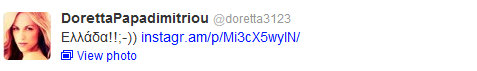 Oι Έλληνες “διάσημοι” αναλαμβάνουν την πρωτοβουλία προβολής της χώρας μας…μέσω twitter! Αν δουν κάτι που τους εντυπωσιάζει, βγάζουν φωτογραφία και την κάνουν post…Το ίδιο έκανε και η Ντορέττα Παπαδημητρίου…